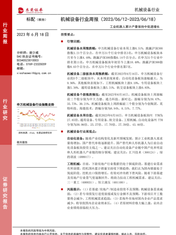 【东莞证券】【20230618】20230618-东莞证券-机械设备行业周报:工业机器人累计产量保持中低速增长-14页