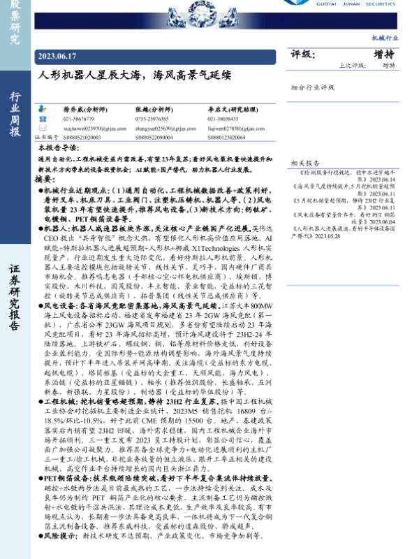 【国泰君安证券】【20230617】20230617-国泰君安-机械行业周报:人形机器人星辰大海,海风高景气延续-36页