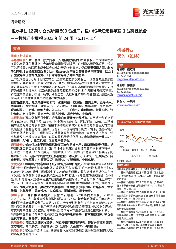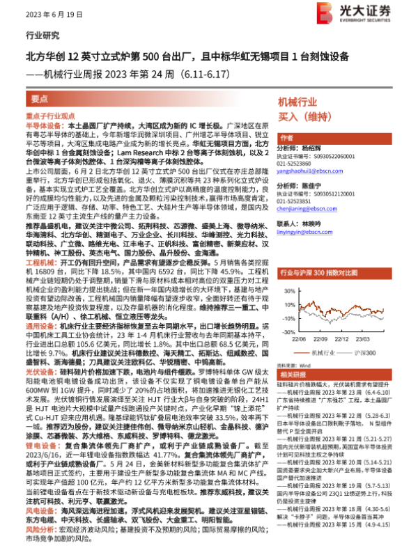 【光大证券】【20230619】机械行业周报2023年第24周:北方华创12英寸立式炉第500台出厂,且中标华虹无锡项目1台刻蚀设备-20页