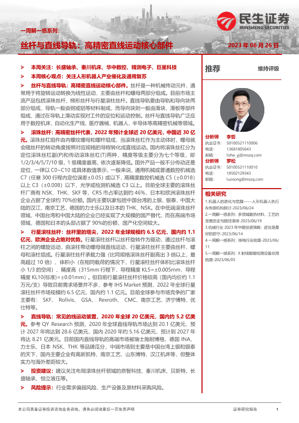 【民生证券】【20230626】丝杆与直线导轨:高精密直线运动核心部件-26页