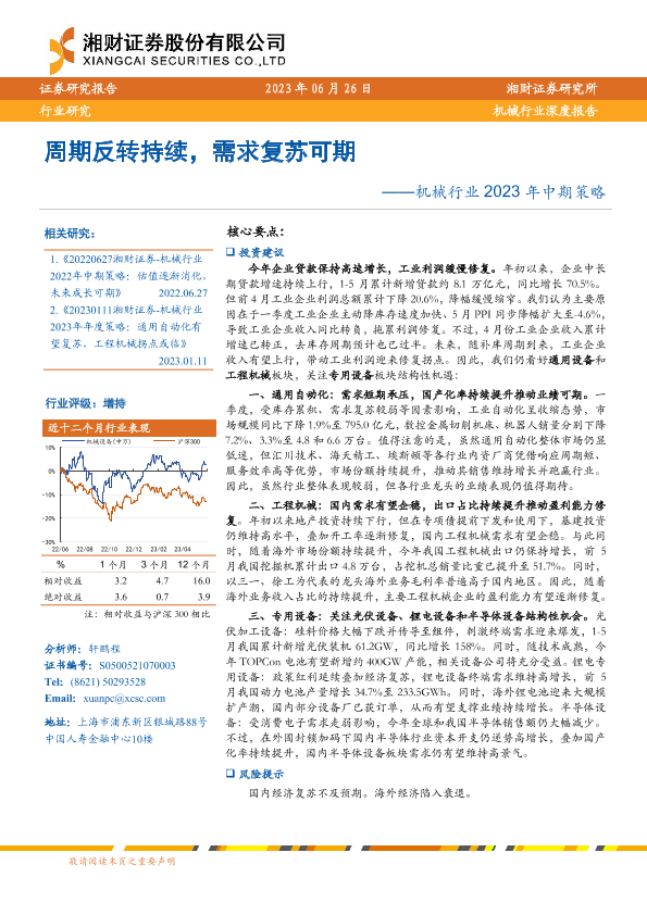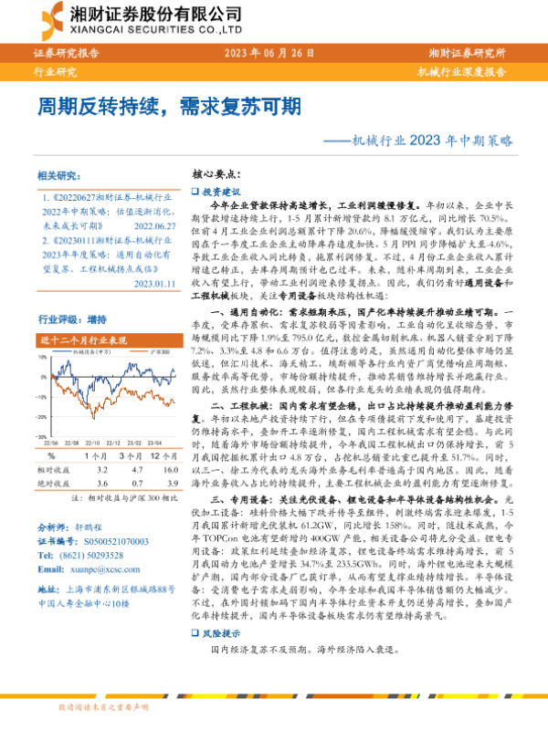 【湘财证券】【20230626】机械行业2023年中期策略:周期反转持续,需求复苏可期-26页
