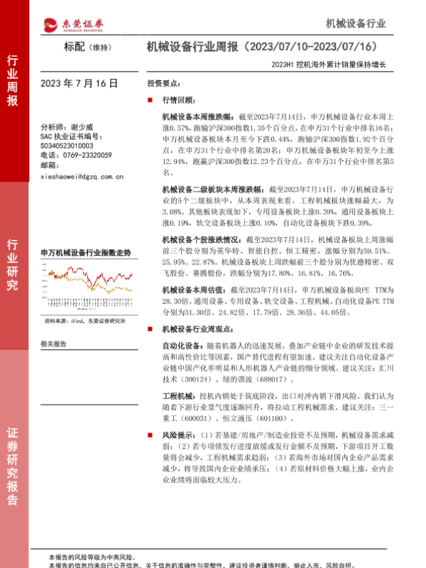 【东莞证券】【20230716】20230716-东莞证券-机械设备行业周报:2023H1挖机海外累计销量保持增长-11页