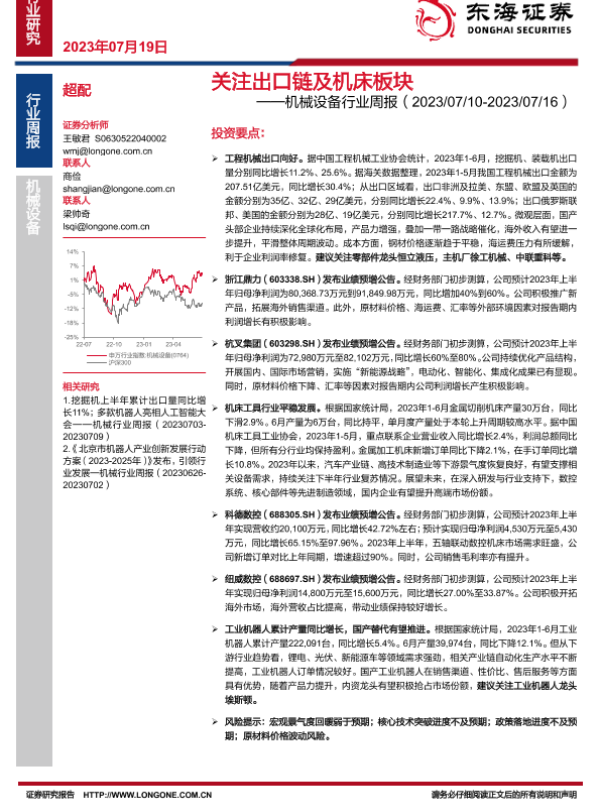 【东海证券】【20230719】20230719-东海证券-机械设备行业周报:关注出口链及机床板块-12页