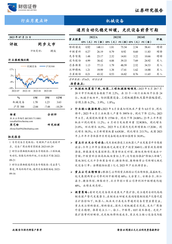 【财信证券】【20230721】20230721-财信证券-机械设备行业月度点评:通用自动化稳定回暖,光伏设备前景可期-15页