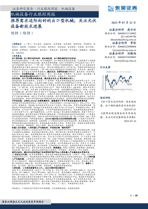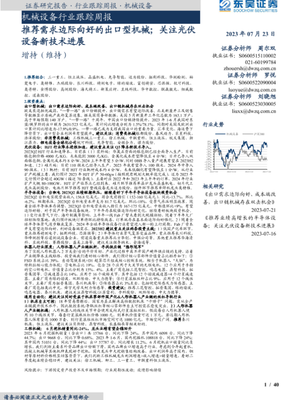 【东吴证券】【20230723】20230723-东吴证券-机械设备行业跟踪周报:推荐需求边际向好的出口型机械;关注光伏设备新技术进展-40页