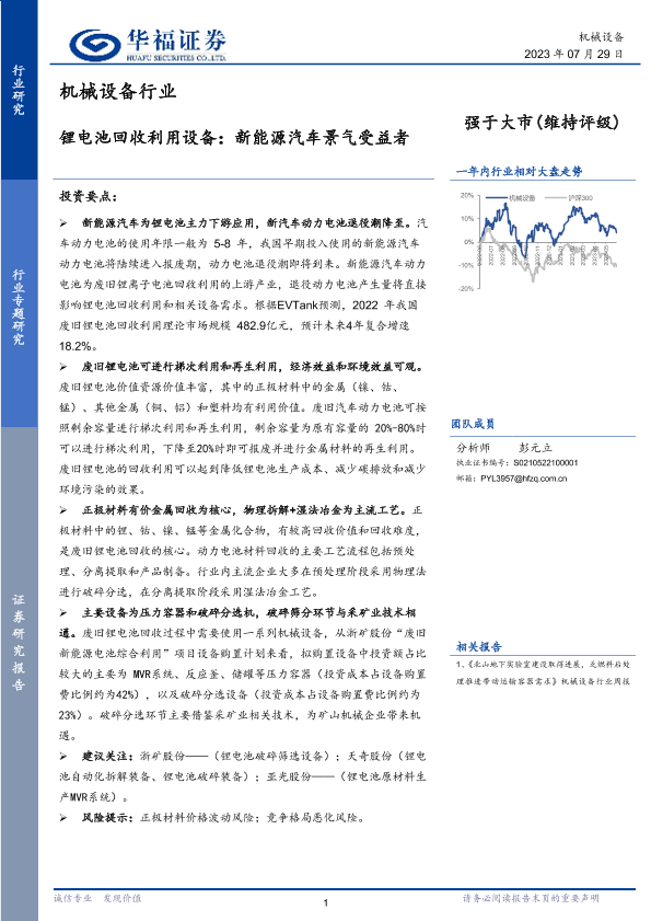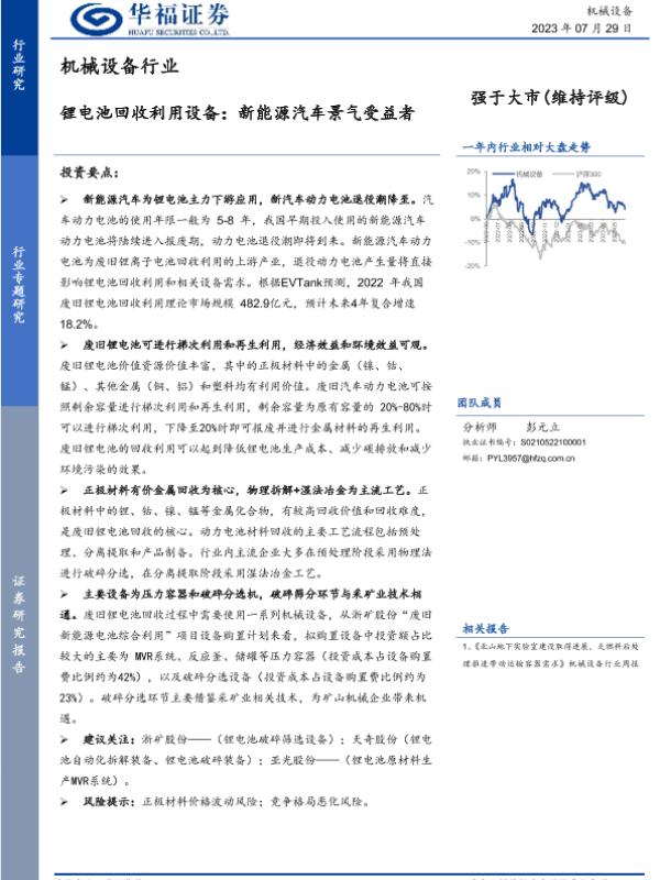 【华福证券】【20230729】机械设备行业:锂电池回收利用设备:新能源汽车景气受益者-13页