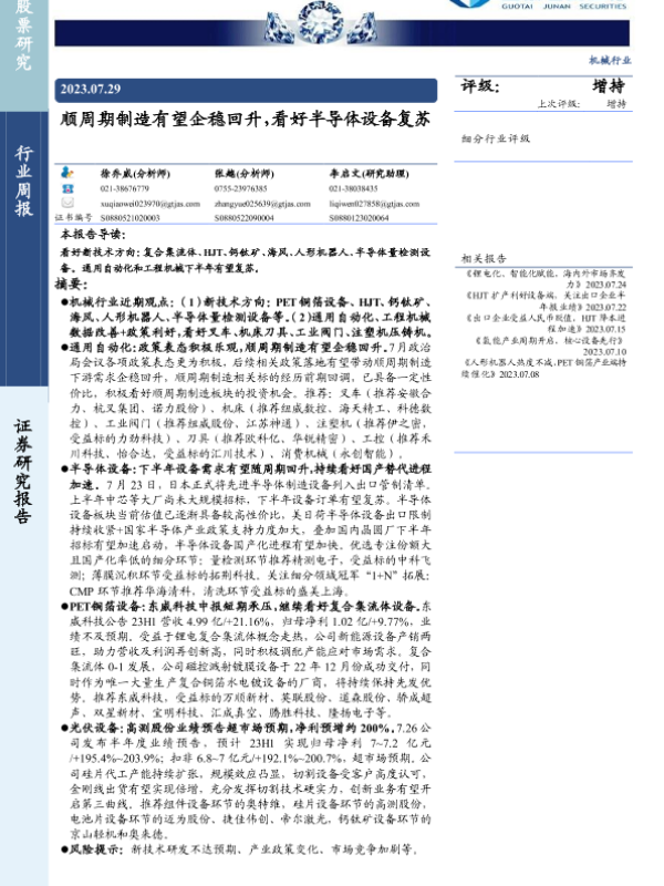 【国泰君安证券】【20230729】20230729-国泰君安-机械行业周报:顺周期制造有望企稳回升,看好半导体设备复苏-33页