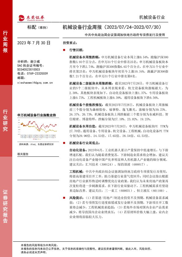 【东莞证券】【20230730】20230730-东莞证券-机械设备行业周报:中共中央政治局会议强调加快地方政府专项债发行及使用-12页