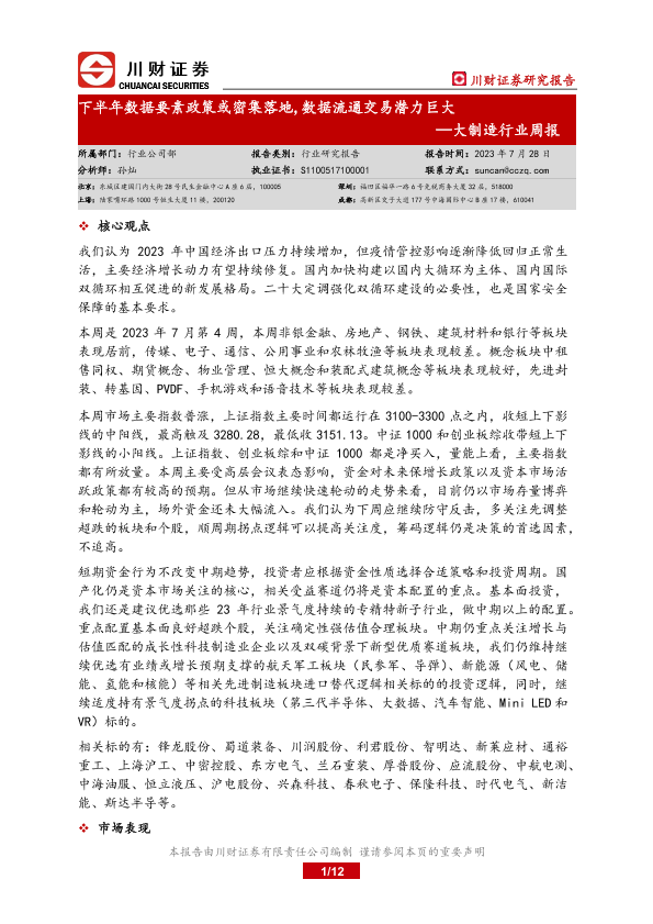 【川财证券】【20230728】20230728-川财证券-大制造行业周报:下半年数据要素政策或密集落地,数据流通交易潜力巨大-12页