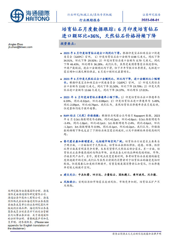 【海通国际】【20230731】20230801-海通国际-培育钻石月度数据跟踪:6月印度培育钻石进口额环比+36%,天然钻石价格持续下降-11页