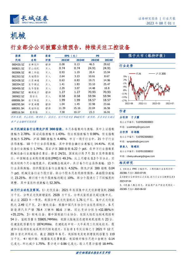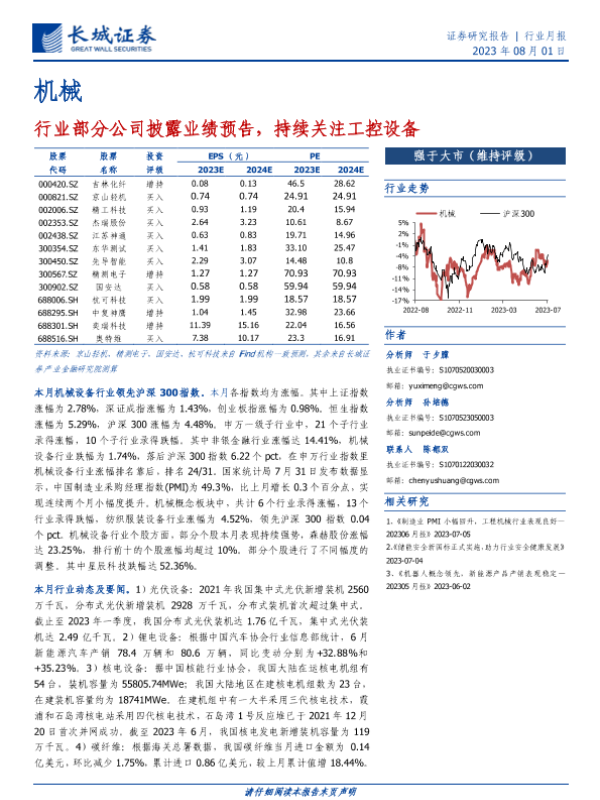 【长城证券】【20230801】20230801-长城证券-机械行业月报:行业部分公司披露业绩预告,持续关注工控设备-18页