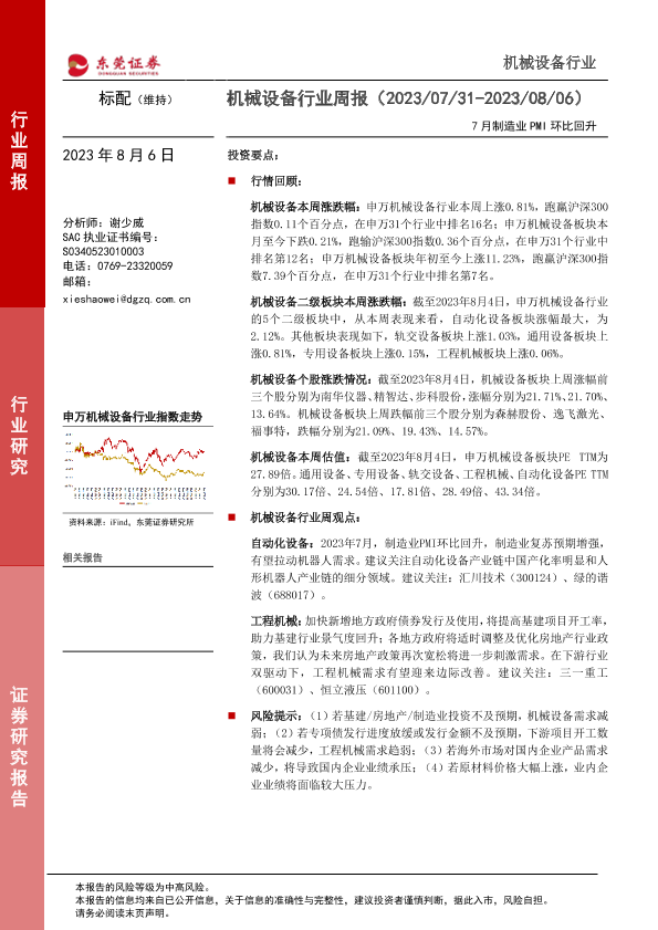 【东莞证券】【20230806】20230806-东莞证券-机械设备行业周报:7月制造业PMI环比回升-11页