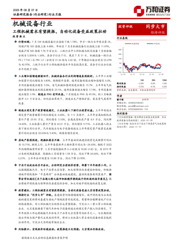 【万和证券】【20230807】20230807-万和证券-机械设备行业月报:工程机械需求有望提振,自动化设备受益政策拉动-11页