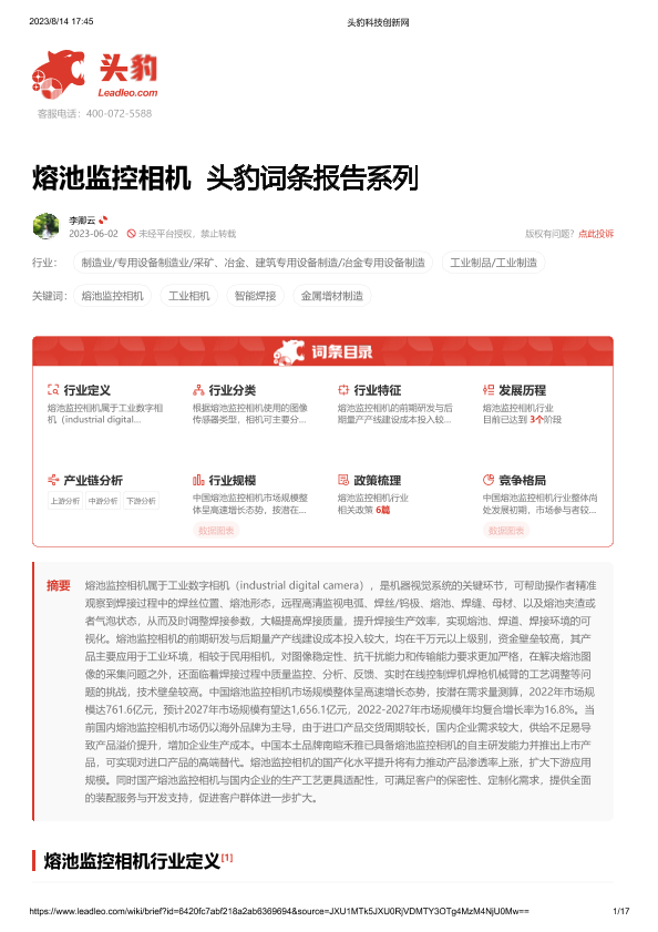 【头豹研究院】【20230814】熔池监控相机 头豹词条报告系列-17页
