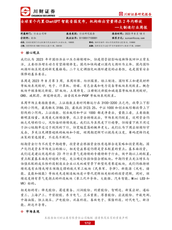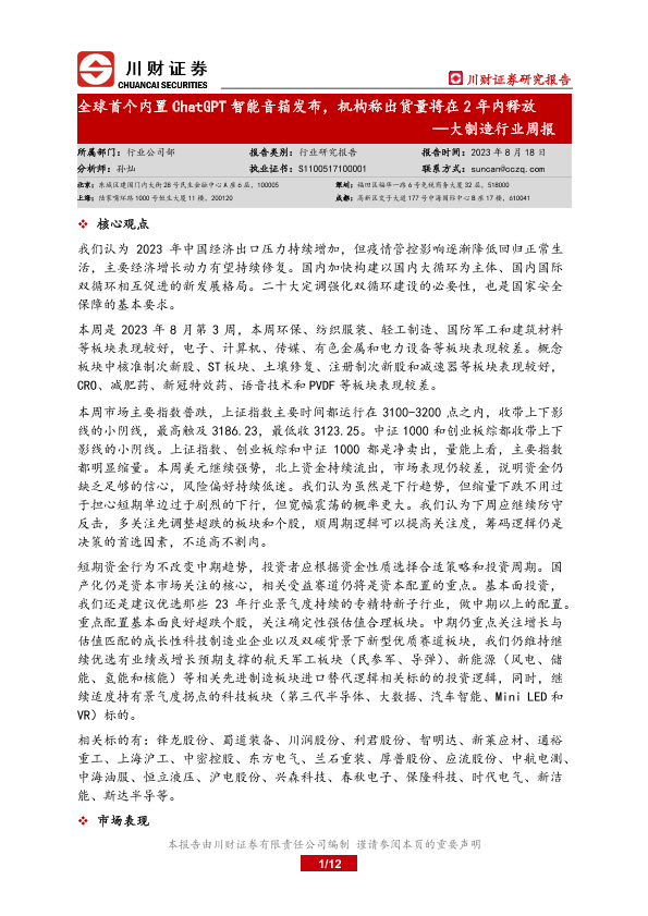 【川财证券】【20230818】20230818-川财证券-大制造行业周报:全球首个内置ChatGPT智能音箱发布,机构称出货量将在2年内释放-12页