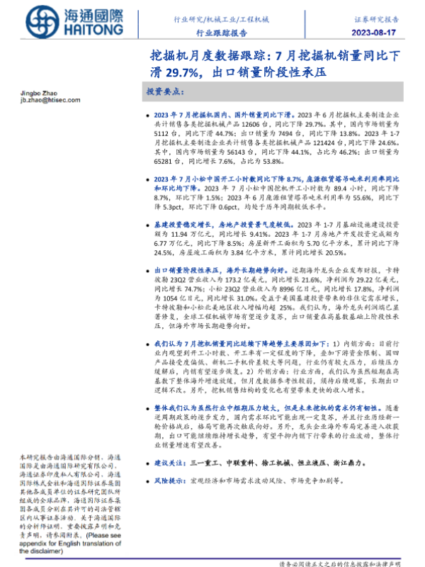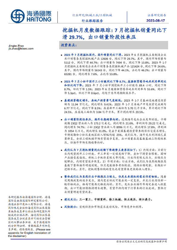 【海通国际】【20230817】20230817-海通国际-挖掘机月度数据跟踪:7月挖掘机销量同比下滑29.7%,出口销量阶段性承压-10页