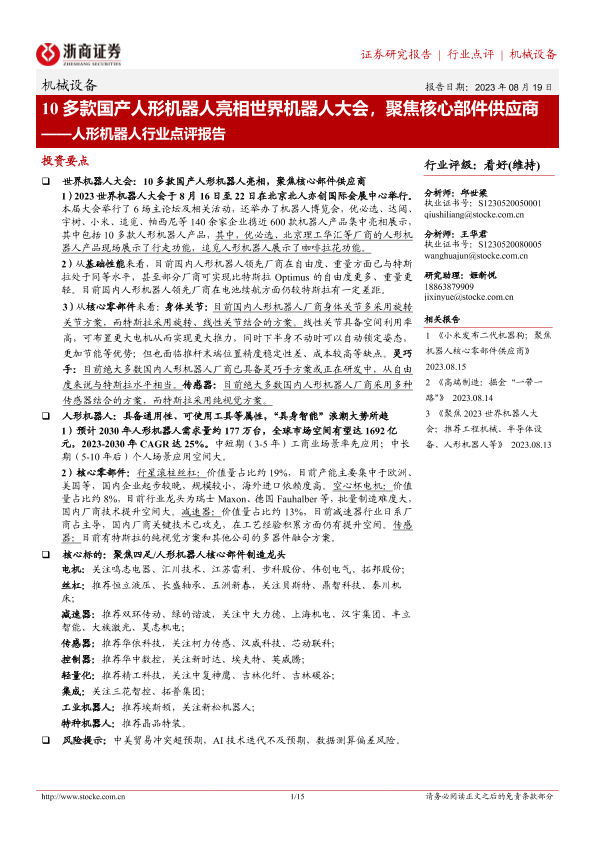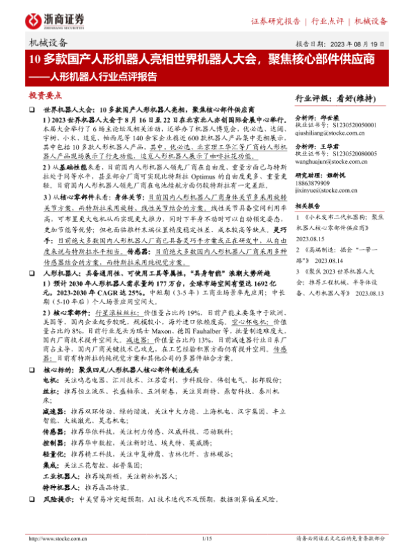 【浙商证券】【20230819】10多款国产人形机器人亮相世界机器人大会,聚焦核心部件供应商-15页