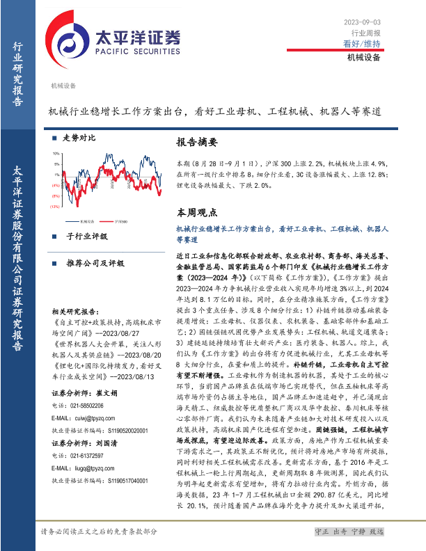 【太平洋证券】【20230903】机械设备行业周报:机械行业稳增长工作方案出台,看好工业母机、工程机械、机器人等赛道-11页