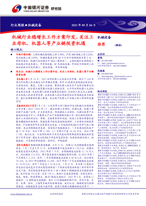 【银河证券】【20230904】机械设备行业周报:机械行业稳增长工作方案印发,关注工业母机、机器人等产业链投资机遇-28页