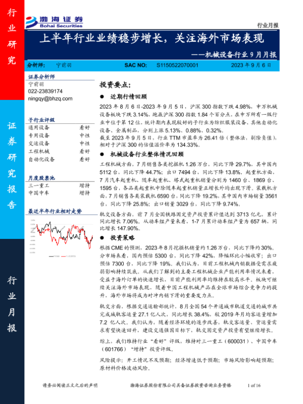 【渤海证券】【20230906】20230906-渤海证券-机械设备行业9月月报:上半年行业业绩稳步增长,关注海外市场表现-16页
