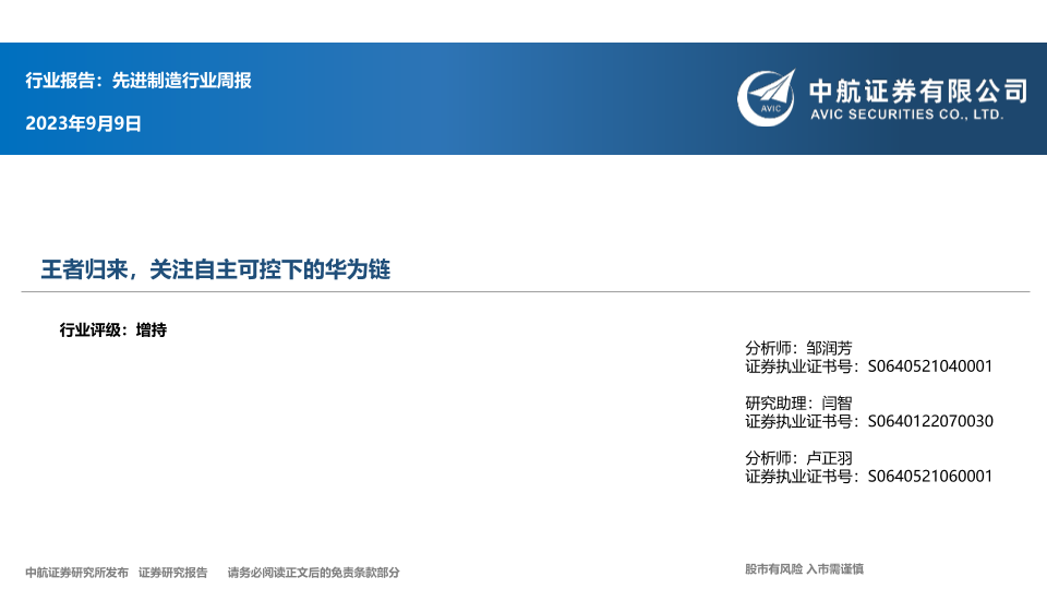 【中航证券】【20230909】20230909-中航证券-先进制造行业周报:王者归来,关注自主可控下的华为链-12页