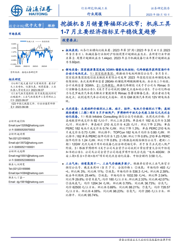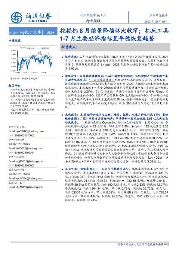 【海通证券】【20230910】挖掘机8月销量降福环比收窄;机床工具1-7月主要经济指标呈平稳恢复趋势-10页