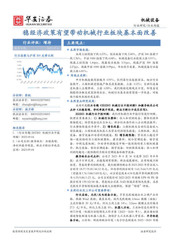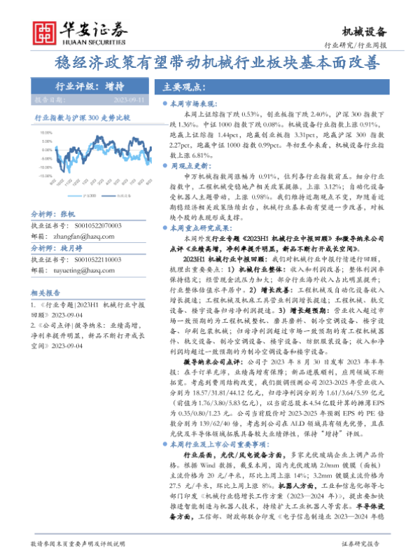 【华安证券】【20230911】20230911-华安证券-机械设备行业周报:稳经济政策有望带动机械行业板块基本面改善-13页