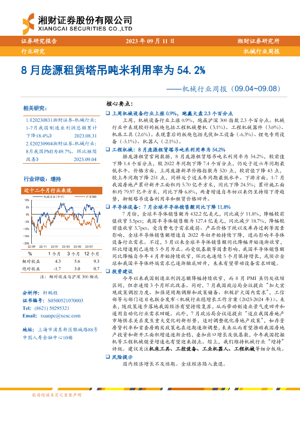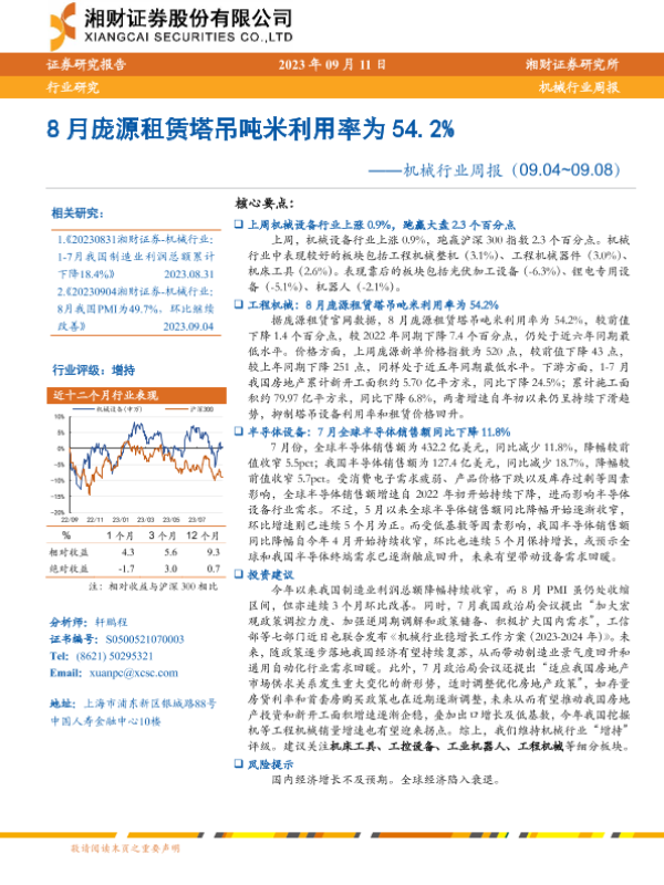 【湘财证券】【20230911】20230911-湘财证券-机械行业周报:8月庞源租赁塔吊吨米利用率为54.2%-13页