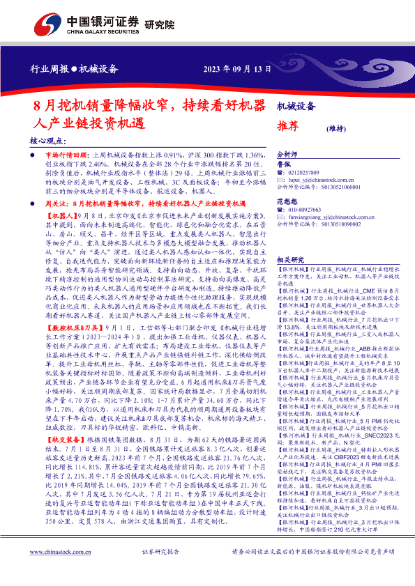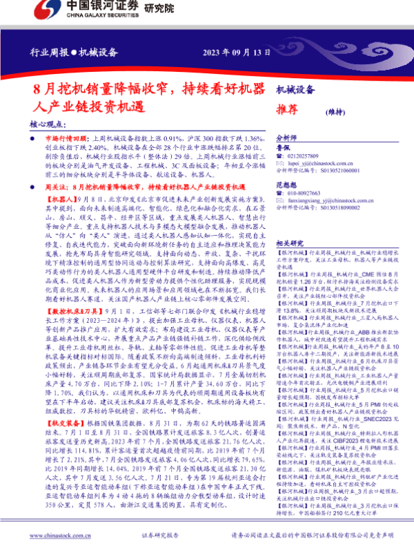 【银河证券】【20230913】20230913-中国银河-机械设备行业周报:8月挖机销量降幅收窄,持续看好机器人产业链投资机遇-21页
