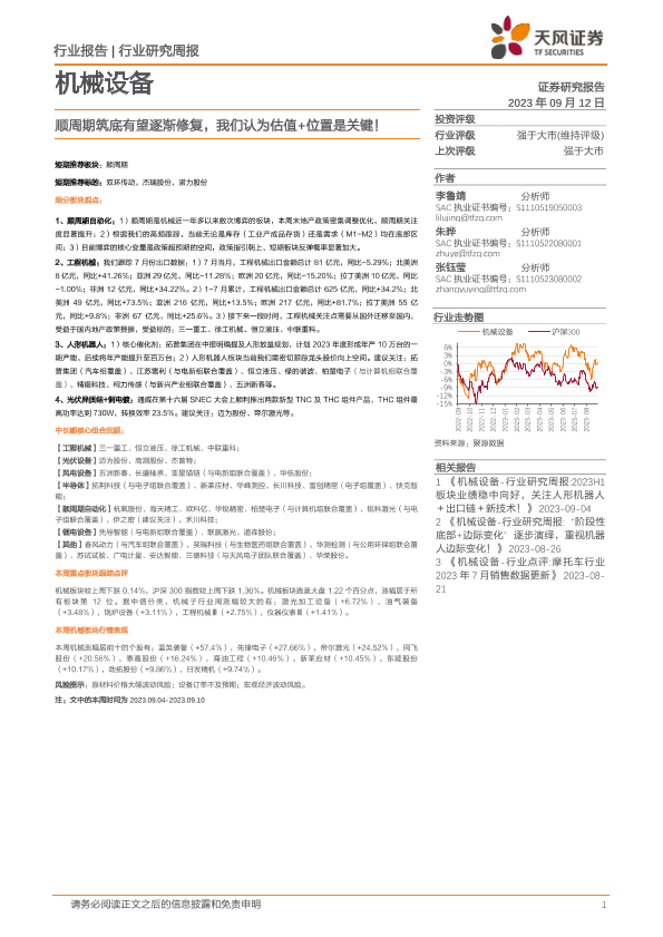 【天风证券】【20230912】20230912-天风证券-机械设备行业周报:顺周期筑底有望逐渐修复,我们认为估值+位置是关键!-13页