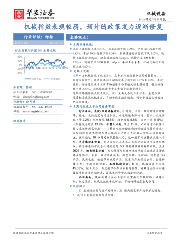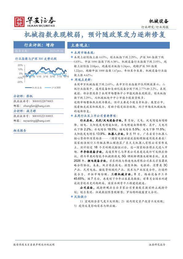 【华安证券】【20230916】20230916-华安证券-机械设备行业周报:机械指数表现较弱,预计随政策发力逐渐修复-11页