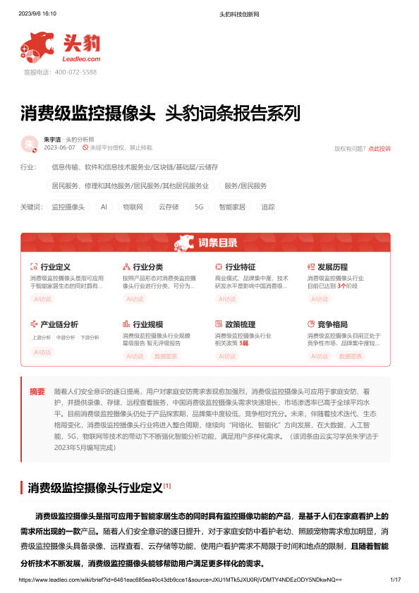 【头豹研究院】【20230914】消费级监控摄像头 头豹词条报告系列-17页