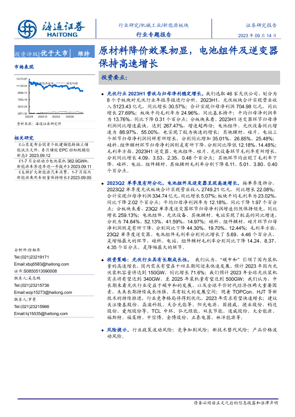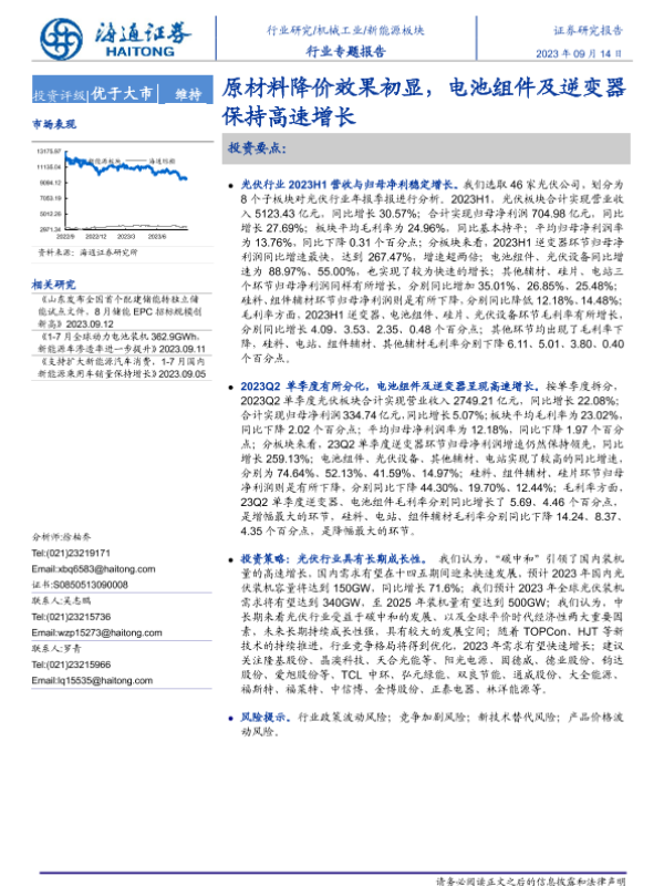 【海通证券】【20230914】20230914-海通证券-机械工业行业专题报告:原材料降价效果初显,电池组件及逆变器保持高速增长-19页