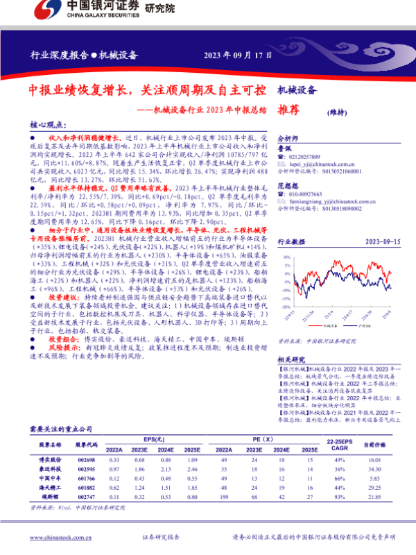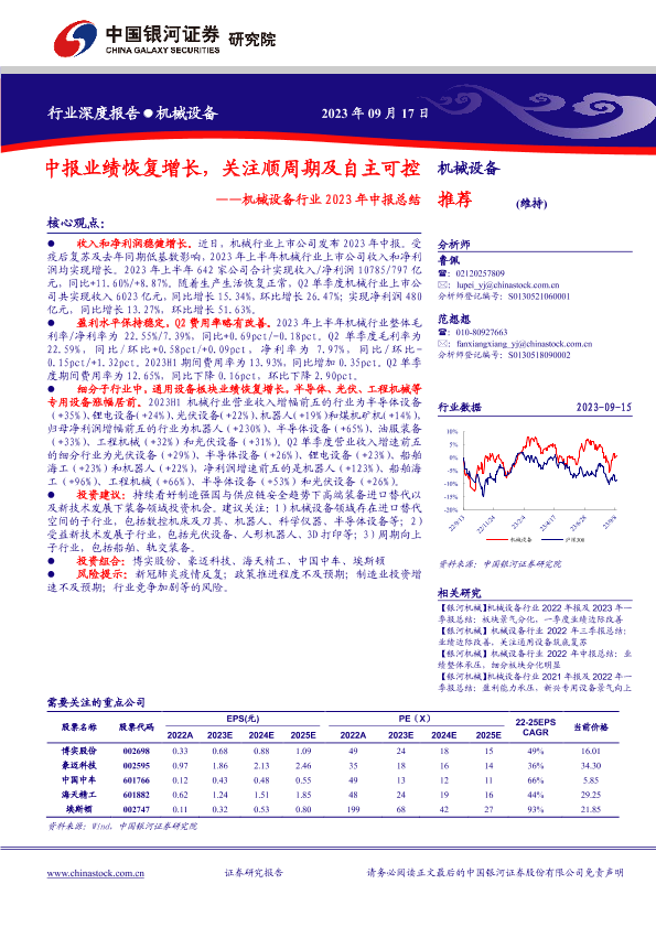 【银河证券】【20230917】机械设备行业2023年中报总结:中报业绩恢复增长,关注顺周期及自主可控-56页