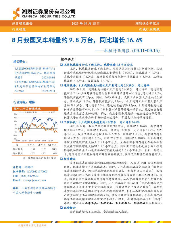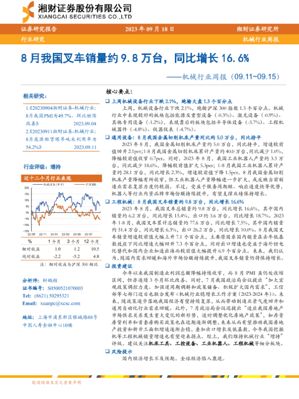 【湘财证券】【20230918】20230918-湘财证券-机械行业周报:8月我国叉车销量约9.8万台,同比增长16.6%-13页