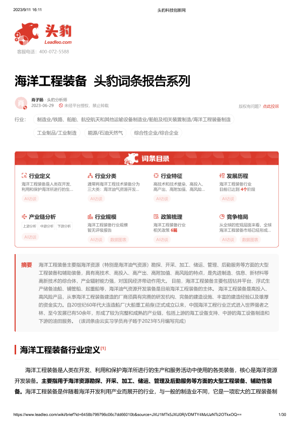 【头豹研究院】【202309】海洋工程装备 头豹词条报告系列-30页