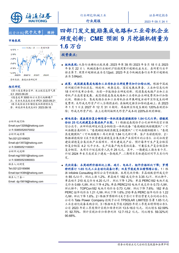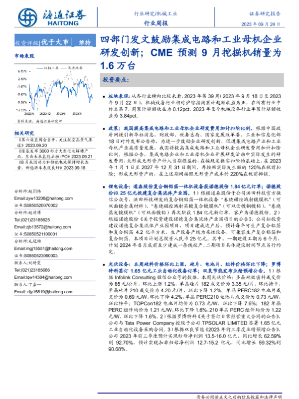 【海通证券】【20230924】20230924-海通证券-机械工业行业周报:四部门发文鼓励集成电路和工业母机企业研发创新;CME预测9月挖掘机销量为1.6万台-10页