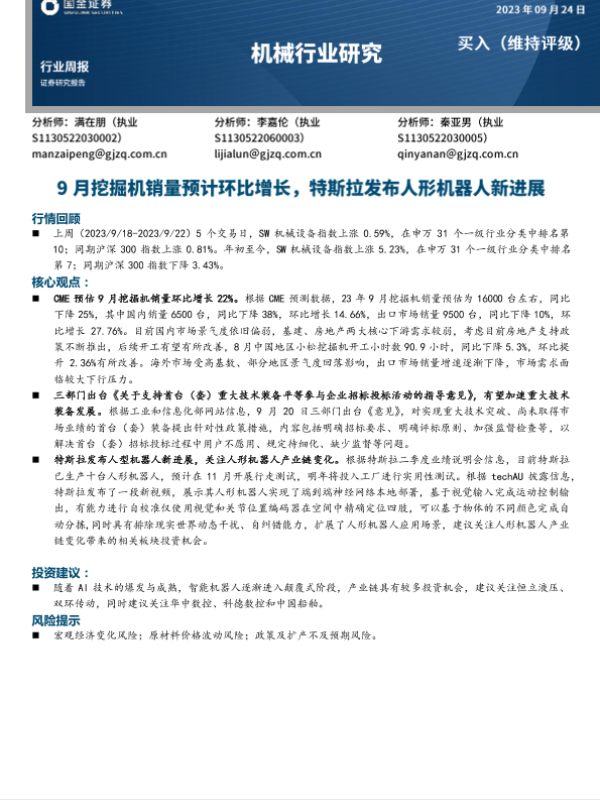 【国金证券】【20230924】20230924-国金证券-机械行业研究:9月挖掘机销量预计环比增长,特斯拉发布人形机器人新进展-15页