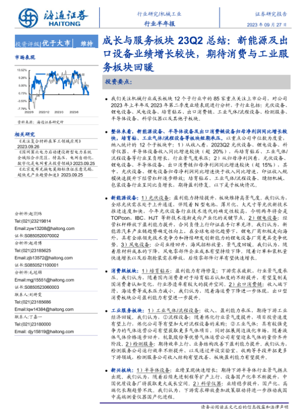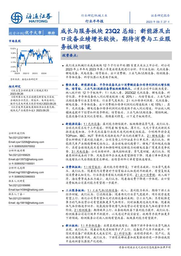 【海通证券】【20230927】20230927-海通证券-机械工业行业半年报:成长与服务板块23Q2总结:新能源及出口设备业绩增长较快,期待消费与工业服务板块回暖-40页