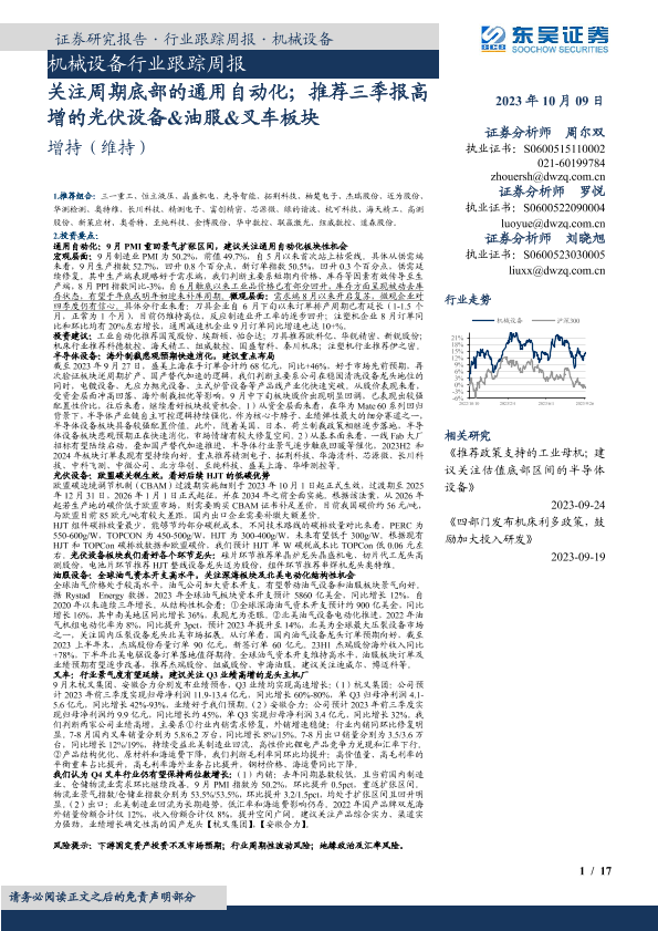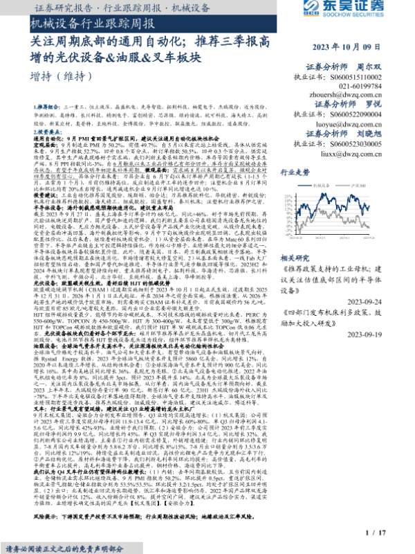 【东吴证券】【20231009】20231009-东吴证券-机械设备行业跟踪周报:关注周期底部的通用自动化;推荐三季报高增的光伏设备&油服&叉车板块-17页