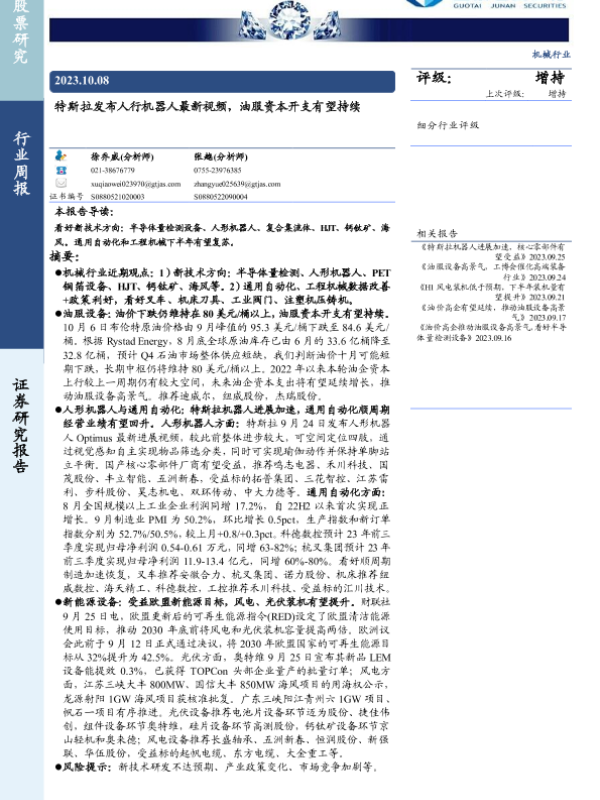 【国泰君安证券】【20231008】20231008-国泰君安-机械行业周报:特斯拉发布人行机器人最新视频,油服资本开支有望持续-33页