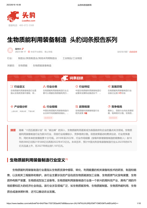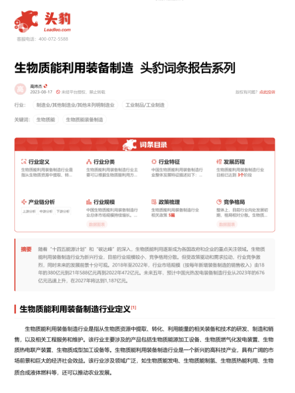 【头豹研究院】【2023】生物质能利用装备制造 头豹词条报告系列-18页