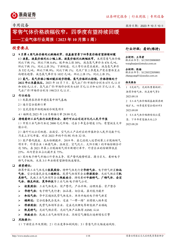 【浙商证券】【20231010】2023年10月第1周:零售气体价格跌幅收窄,四季度有望持续回暖-18页