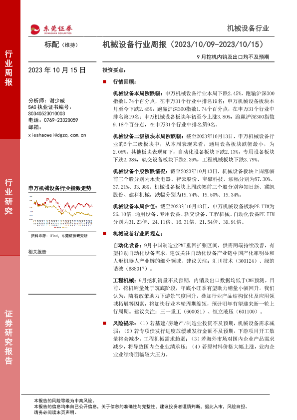 【东莞证券】【20231015】20231015-东莞证券-机械设备行业周报:9月挖机内销及出口均不及预期-11页