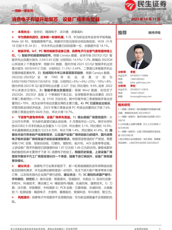 【民生证券】【20231015】一周解一惑系列:消费电子有望全面复苏,设备厂商率先受益-24页