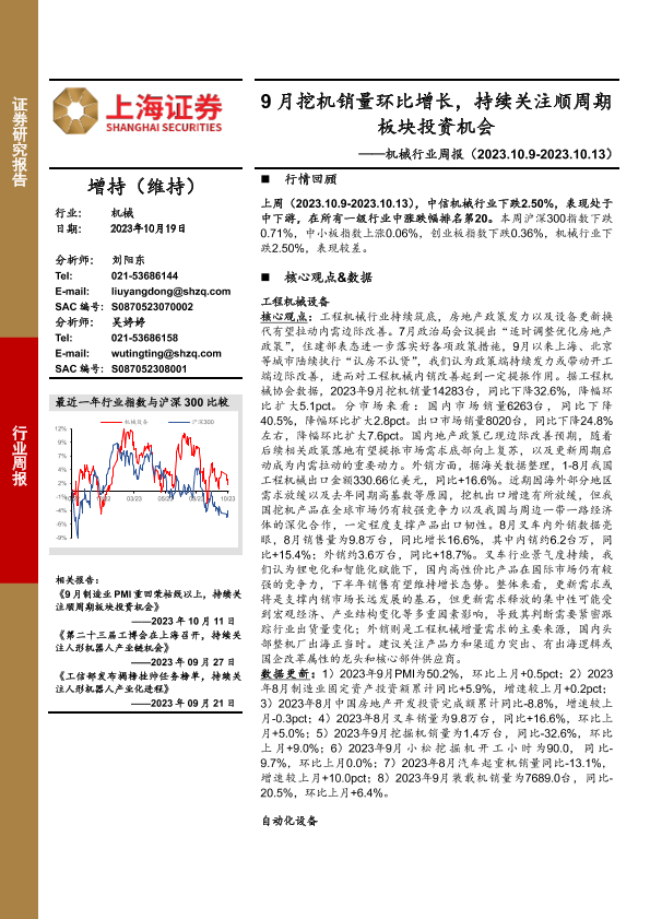 【上海证券】【20231019】20231019-上海证券-机械行业周报:9月挖机销量环比增长,持续关注顺周期板块投资机会-23页