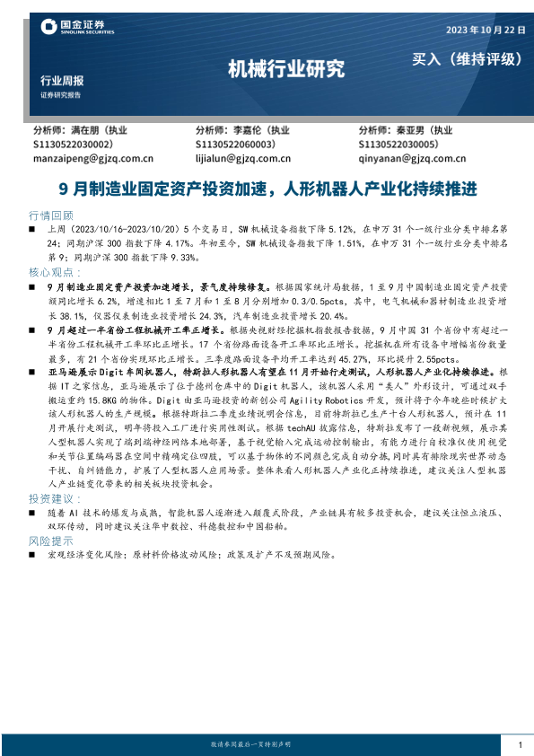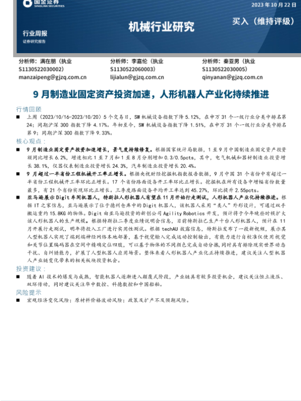 【国金证券】【20231022】20231022-国金证券-机械行业研究:9月制造业固定资产投资加速,人形机器人产业化持续推进-16页