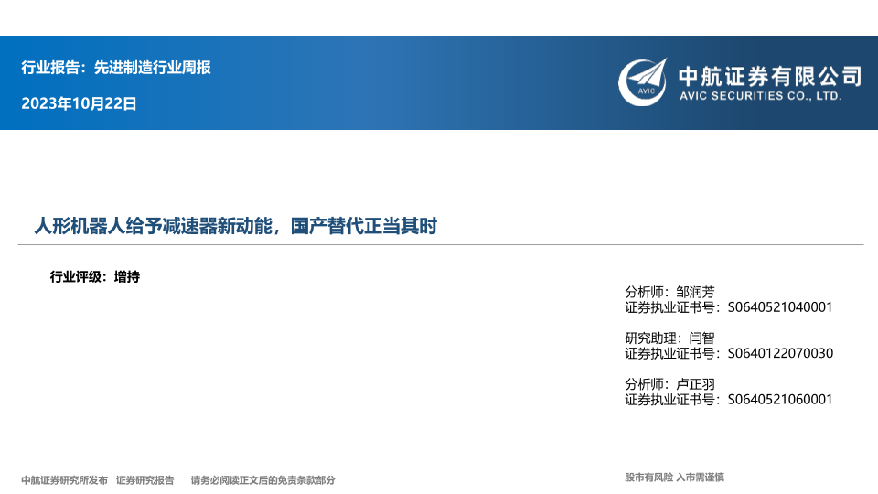 【中航证券】【20231022】20231022-中航证券-先进制造行业周报:人形机器人给予减速器新动能,国产替代正当其时-11页