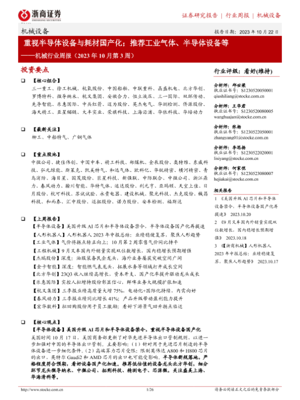 【浙商证券】【20231022】机械行业周报(2023年10月第3周):重视半导体设备与耗材国产化;推荐工业气体、半导体设备等-26页