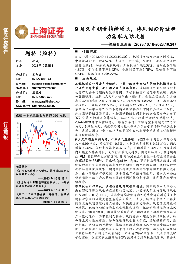 【上海证券】【20231025】20231025-上海证券-机械行业周报:9月叉车销量持续增长,海风利好释放带动需求边际改善-19页